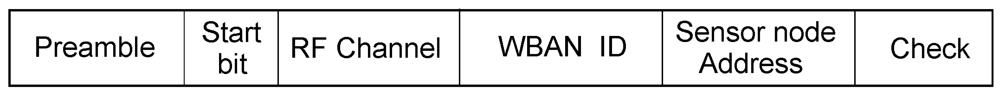 The wake up packet can be a network address assigned during network forming, or a hardware MAC identifier as defined in a protocol, for better robustness and better reliability in the case of the multiple BANs operating in the vicinity. In the case of Bluetooth, a MAC-48 identifier can be used, or in case of ZigBee, EUI-64. The wake up packets can optionally contain some other defined commands and identifiers, if there is a need to address multiple sensors at once, but one has to note that if higher sensitivity is required, lower data rates must be used for the WUR (1–5 kb/s), so the wake up packets can be longer in time compared to other WBAN communications.