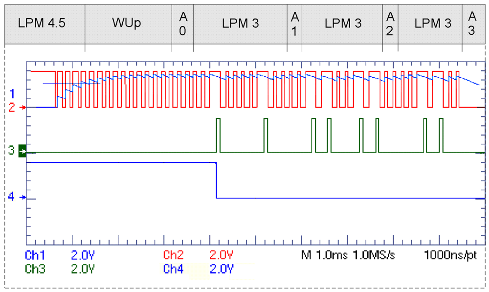 For the whole application, we also have to take into account the communication power and the effect that the protocol has on the microcontroller power consumption. In any low power application, the sleep modes are used for the microcontroller when it is not needed in order to save power. The more the protocol needs the microcontroller's resources, the higher effect it has on the communication power consumption, depending on the type of the microcontroller. This becomes very important when we have long sleeping intervals and the whole sensor could be switched off. Even the type of Low Power Mode is important in which the microcontroller awaits the wake up signal, or processes it. For example, in Figure 7 it is shown how for our wake up receiver, the microcontroller can be in shut-down mode until it gets a wake up signal, and then with a few very short active modes, processes it. This is very important, because wake up receivers would not have good filtering and multi-frequency operations, and the sensors would overhear signals that are not intended for them. Table 3 shows the MSP430 power modes while receiving a packet.