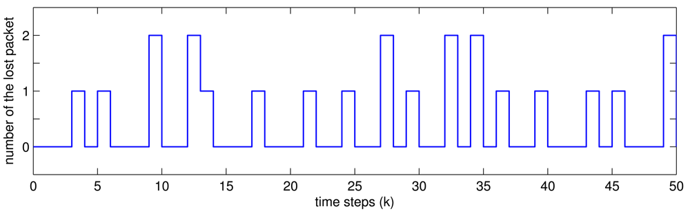 Assume the sampling period is h = 1s, and packet transmission is as shown in Figure 2, which is subject to the rate of packet lost 1 − δ̄ = 0.32.