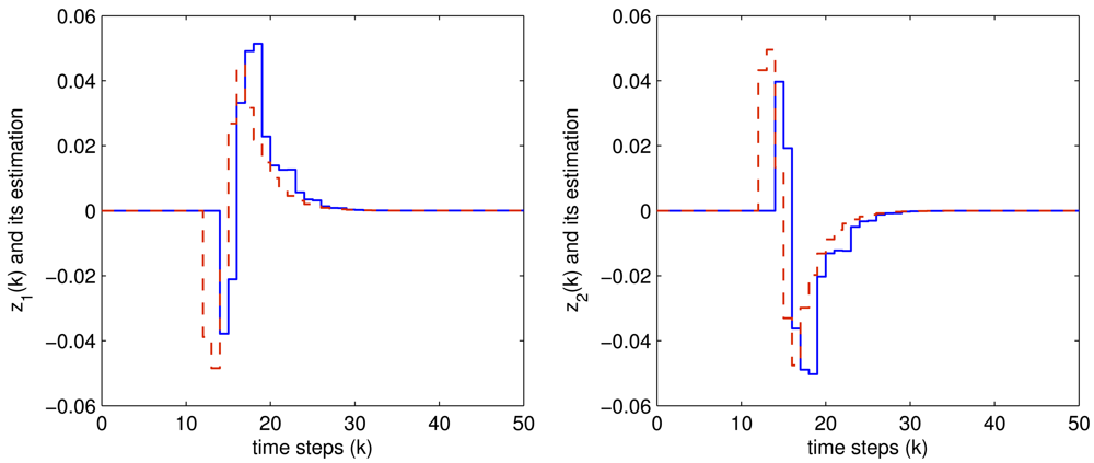 The controlled outputs and the corresponding estimations for both the two fault modes are shown in Figures 4 and 5, respectively, where the blue solid lines are the controlled output while the red dashed lines are their estimations.