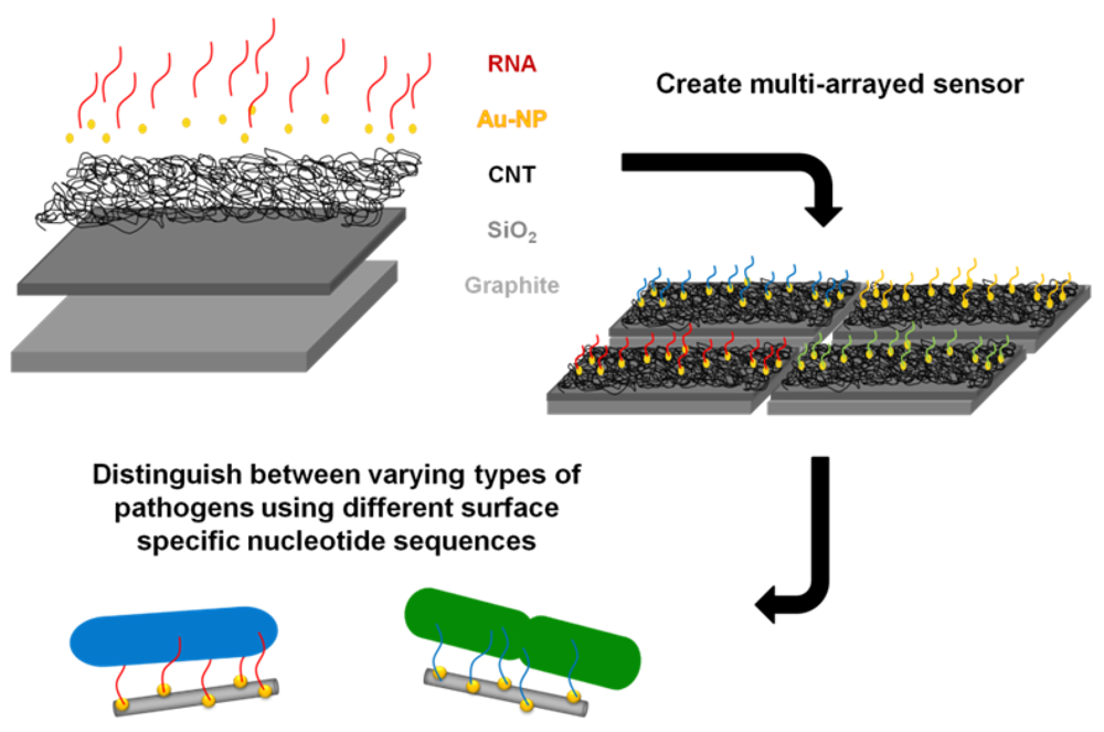 Furthermore, this research demonstrated that carbon substrates, in bulk and nano-scale, were able to be utilized in the development of a novel sensor to detect pathogens in the environment. We are confident from this work that utilizing novel nanostructures for the application of a bio-sensor in bacterial detection and identification is attainable. This same sensing approach outlined here can easily be applied to other bacterial surface-specific RNA sequences, attaching them in the same manner, and ultimately creating an electrochemical multi-array sensor to determine the strain of bacteria as well as their aqueous solution concentration. Additionally, this process can be extended to other microorganisms to identify and quantify targets through the development of a hand-held multi-array sensor.