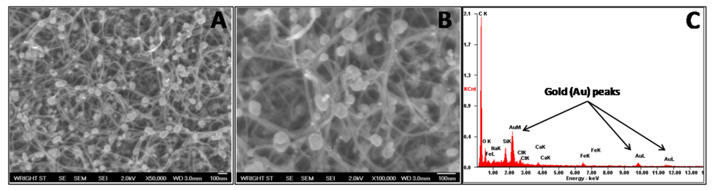 To ensure the presence of gold nanoparticles, their successful attachment to the CNT surface, and even distribution, SEM images were obtained (Figure 3(A,B)). These images demonstrate well dispersed, strongly adhered gold nanoparticles with a low agglomeration level. For these particles, a size distribution of 44.9 ± 14.4 nm was determined. Furthermore, EDS results indicated a strong presence of gold within the sample, further confirming successful composite formation (Figure 3(C)).