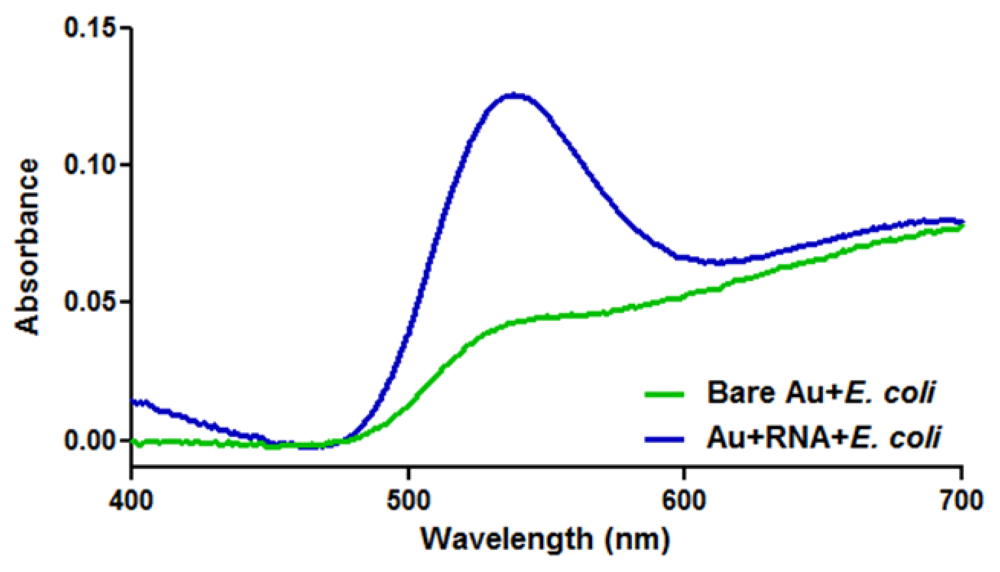 After RNA coating, the gold particles were then exposed to E. coli to quantify targeted RNA attachment. All experiments were conducted in triplicate to verify findings. First, at room temperature, 400 μL of 106 concentration of DH5α in PBS was combined with 100 μL of the coated particles. This experiment was run in parallel with 100 μL of bare gold nanoparticles to allow for direct comparison. The samples were rocked for 20 minutes then spun down at low speed, to pellet the bacteria but not the unbound particles. The cellular pellet was suspended in sterile water for UV-Vis measurements. One milliliter of the sample is placed in a quartz cuvette and absorption is measured from ∼200 nm to 800 nm. Baseline absorbance spectra from excess RNA and E coli were removed from the overall absorption to ensure only readings from the nanoparticles were measured.