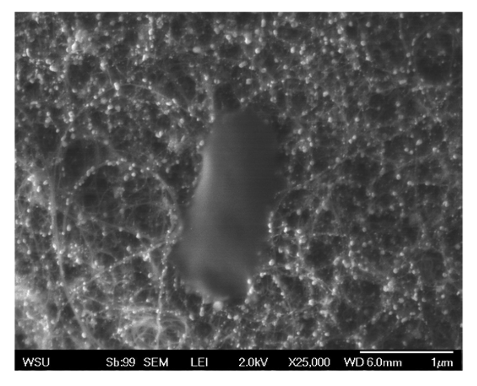 After independently confirming gold nanoparticle growth on the bound CNTs and successful RNA coating of gold nanoparticles, the final step was to construct and assess the effectiveness of the complete biosensor. Therefore, following synthesis of gold nanoparticles on the graphite bound CNTs the particles were subsequently functionalized with the thiolated RNA sequence specific for the DH5α E. coli strain. Following introduction of E. coli to the biosensors, they were washed and SEM imaged to evaluate extent of microbial association. As seen in Figure 5, this sensor was capable of strongly binding E. coli molecules, however no significant difference was observed between the bare and RNA coated sensors. After further investigation, we believe that this lack of RNA specificity is due to interactions between the RNA and the carbon nanotube surface. It has been shown that CNTs interact with the conformation of nucleic acids [19] due to their π-π stacking interactions [20]. We speculate that this unintentional coupling is resulting in the folding over of a high percentage of RNA molecules, thus making them unavailable and reducing potential binding sites. Future research will focus on developing a mechanism to minimize this concern and improve targeted E. coli binding, as well as an amperometric analysis of the overall structure.