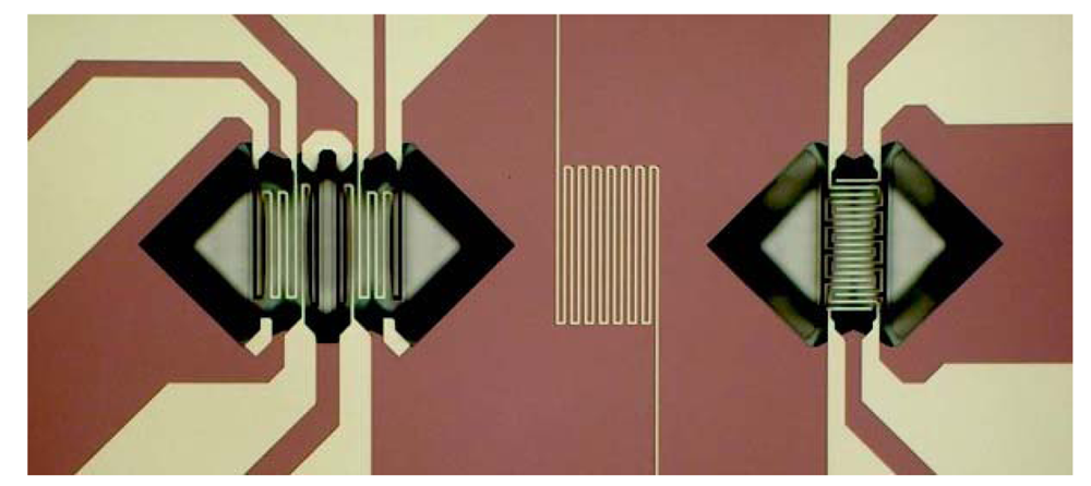 The sensor platforms of the present work have been developed with micromachining techniques in order to provide multiparametric sensors equipped with transducer for air temperature, air velocity, and gas detection, as shown in Figure 1. The transducer for air temperature is a Pt-wire thermometer deposited as a thin film with serpentine shape on the bulky central portion of the platform. Due to their high temperature operations, the anemometer and the gas sensor are both supported by micro-hotplates (more precisely, micro-hot-structures having “bridge shape” instead of “plate” shape). The anemometer flow sensor is composed by a heating element with two temperature sensors up- and downstream: the air flow causes anisotropic heat distribution that is measured by the mismatch of the two temperatures at heater sides. The gas sensor is realized with a microbridge having a heater and two interdigitated electrodes for the read-out of sensing layer resistance. Both the anemometer and the gas sensor microbridge structures were obtained by a micromachining route adopting front-side etching [18].