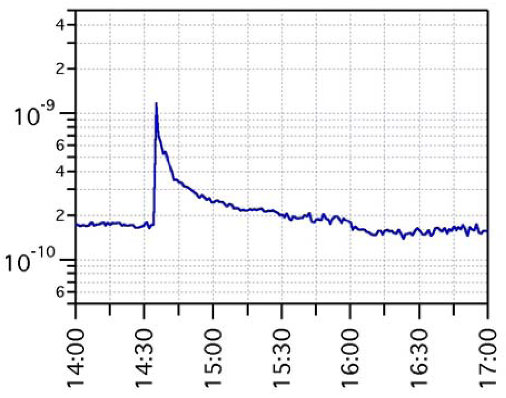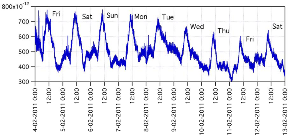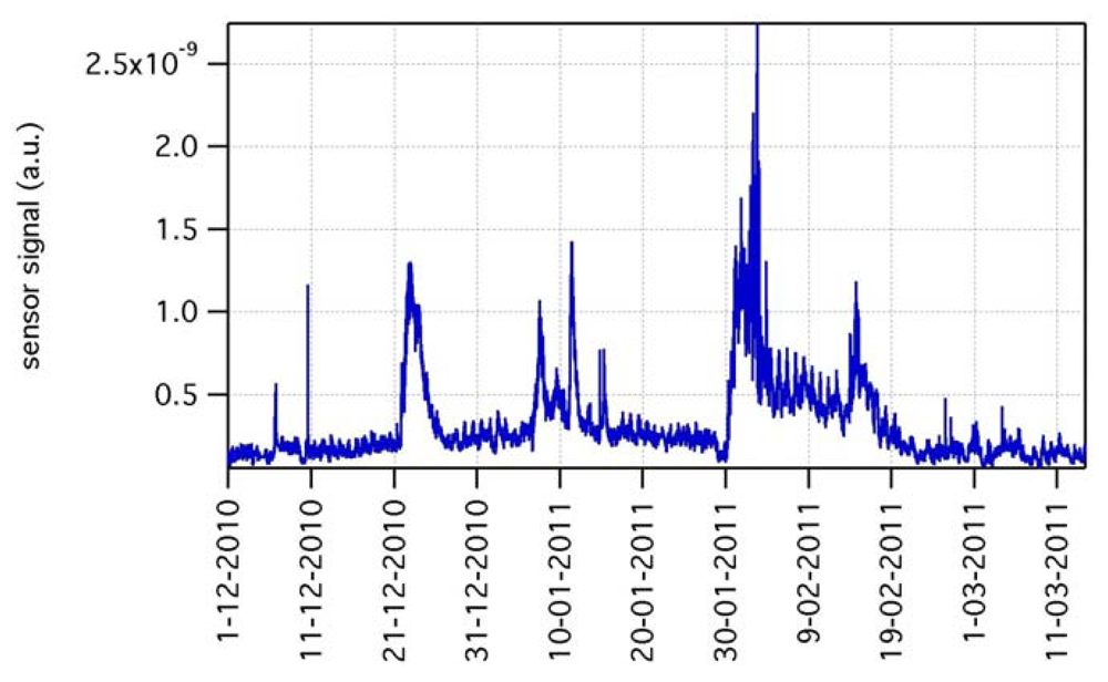 The gas sensing dataset spanning over such a long period is very rich in features and dynamics. Events such as seasonal change (and related modulation of buildings heating systems), working days-weekend rotation (and related modulation of automotive emissions), Christmas and New Year's Day holidays (and related changes of downtown life), etc., may all contribute to signal features. The same holds for single random events, such as big truck transit along the road or cars maneuvers in a car parking close to ARPA station. Provided these heterogeneous scenarios, non-selectivity of microsensors may play a key role in the detection of any change in the chemical composition of the atmosphere, no matter the specific gas that caused it. Figure 9 shows the signal of one of the gas sensors over the period December 2010–March 2011. According to accepted approach in the definition of the response of metal-oxide sensors to reducing compounds as R0/R, where R is the sensing layer resistance and R0 is a constant, the sensor signal is plotted as 1/R. The graph highlights the superposition of various structures: a rather regular and stable baseline, a day-night modulation, various long-lasting sensing events with many-days tails, and various short-lasting events with few-hours tails. Signal variations during sensing events, either long or short lasting ones, may be as high as more than one order of magnitude of baseline level. Figures 10 and 11 are zoomed-in portions of Figure 9, showing examples of one short-lasting event, and of a one-week-long day-night modulation, respectively.