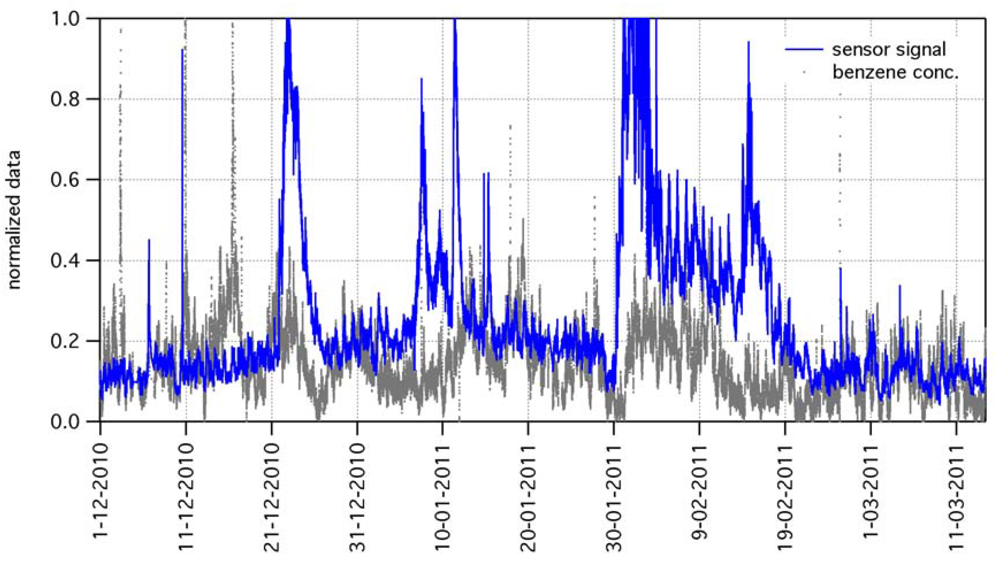 Although the dataset includes measurements from GC instruments (concentrations of NO, NO2, CO, benzene, toluene, and xylene), as well as measurements of temperature and humidity, the correlation of gas sensor signal features to those variables is anything but a straightforward task. For example, Figure 12 shows the data of benzene concentration beside the gas sensor signal (same data of Figure 9, after suitable normalization).