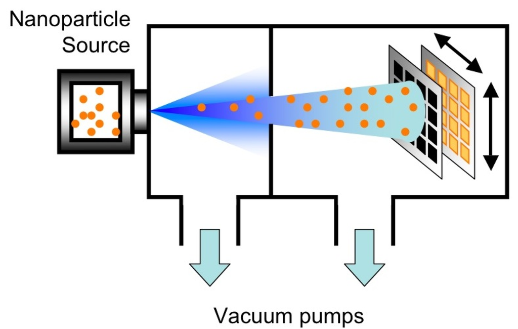 Exploiting non-contact, hard-mask patterning we deposited the nanoporous sensing layer on the platform region dedicated to gas sensing only, avoiding any contamination of other regions. Batches of several tens of devices were deposited at the same time by sample holder rastering, which consists in up-down, left-right scans of the device batch in front of the nanoparticle beam. Delicacy of gas-phase deposition providing mechanical safety with respect to micromachined parts, one-step method for patterning the deposition over desired areas, absence of solvent/paste contamination, batch deposition of many devices per run, are in summary the main features of SCBD method, making its use for functionalization of micromachined parts particularly interesting.