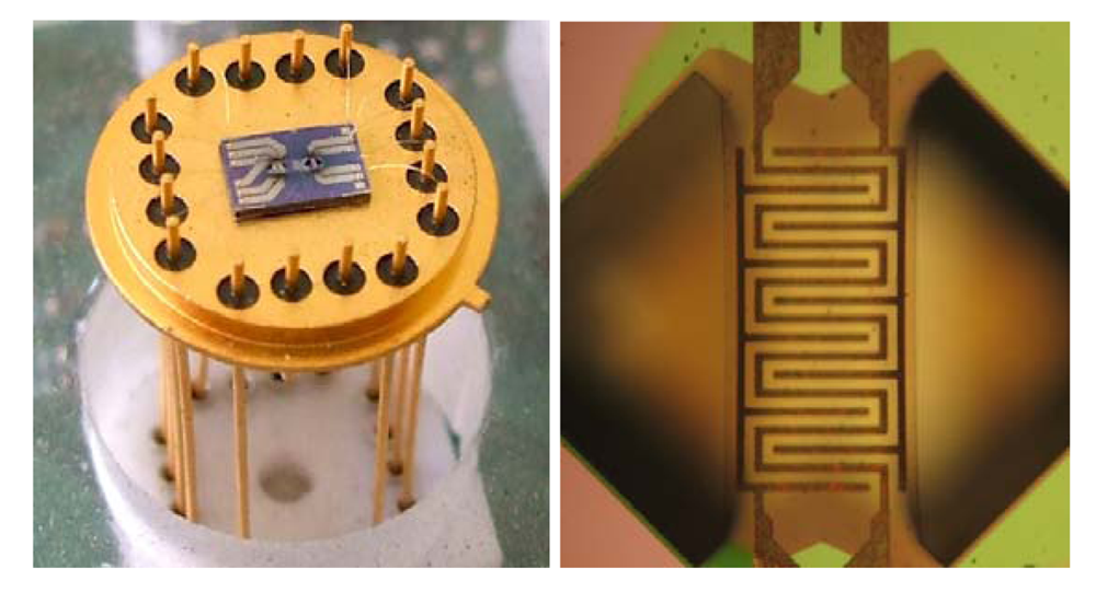 Regarding nanoporosity, it has been demonstrated that no substantial change occurs during this treatment [17]. Device preparation concludes after proper bonding to 16-pins TO package (Schott). Figure 4 shows the bonded device; in the inset, a detail of the gas sensing region of the platform is shown. Proper caps were chosen according to the characterizations to be carried out on the device: tube-shaped cap was adopted for lab-scale testing of anemometer performances (and anemometer in combination with gas sensor); a suitable Teflon cap, equipped with proper holes to favor gas diffusion toward the sensing platform, was adopted for outdoor experiments.