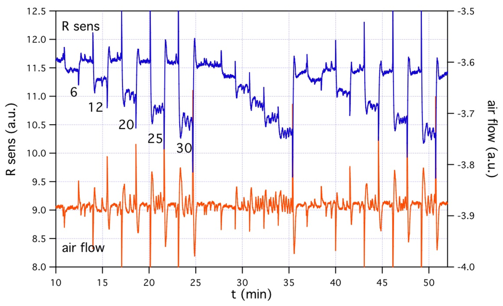 To ensure proper meaning to anemometric air-flow measurements, a suitable tube-shaped cap was adopted and connected to gas line from MFCs. It is worth to highlight that, in this case, the absence of the test chamber, that acts as a gas buffer volume, allowed devices to unveil the dynamics of test atmosphere changes, related to real MFC operations, and gave us the opportunity to evaluate response and recovery dynamics of the gas sensor. Since no differences exist among gas dynamics as seen by the anemometer and by the gas sensor, even in the cases of sharpest structures, we conclude that gas sensor is not affected by some intrinsic delay mechanism slowing down its behavior, and may be used for the real-time monitoring of atmosphere, at least down to dynamics as fast as few tens of seconds.