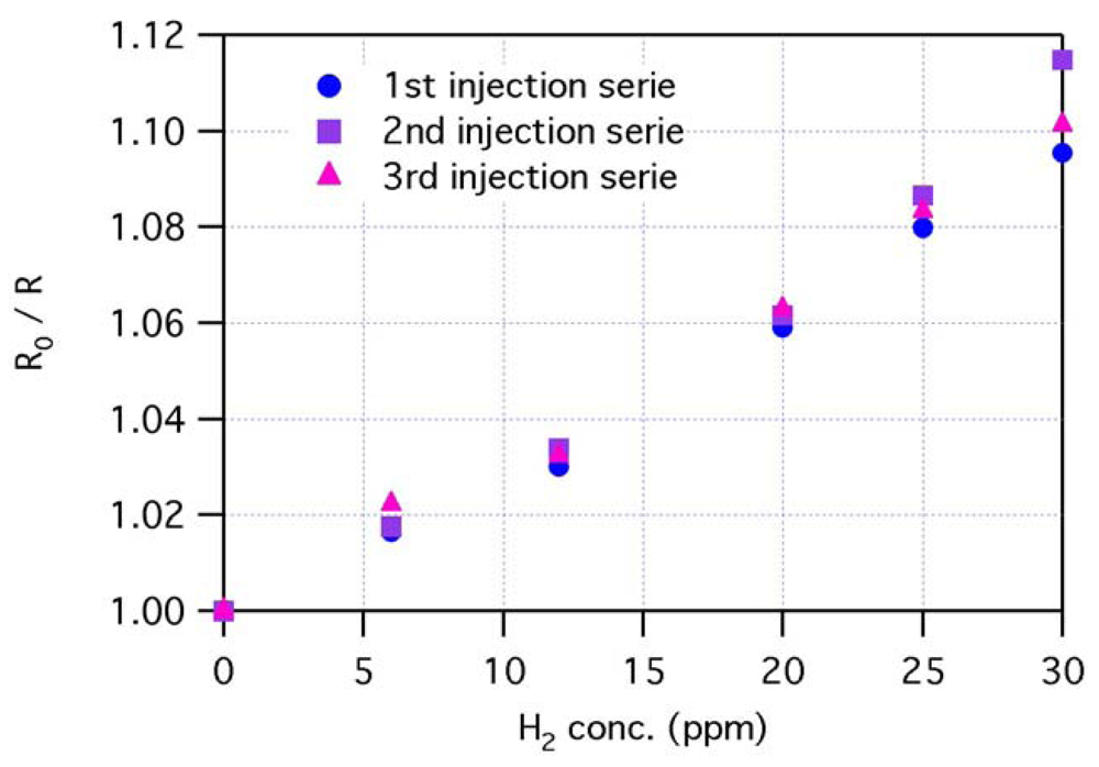 The bottom graph of Figure 5 shows the response of the sensor to hydrogen, as calculated on the data of top graph: R0 is the baseline resistance value, i.e., in absence of hydrogen, while R is the resistance value at a given hydrogen concentration. Data from “single step” first injection, “increasing steps” second injection, and “single step” third injection are included. In the case of “single step” injections, R0 values are the ones just before the injection; in the case of “increasing steps” injection, R0 is the value just before the first step. In all cases, the values used for calculations are the mean values over the time interval of each nominal concentration, excluded the first peak due to concentration change. Response dataset shows very good repeatability of chemical sensor at lab-scale testing, in the case of hydrogen at concentrations of 6–30 ppm.