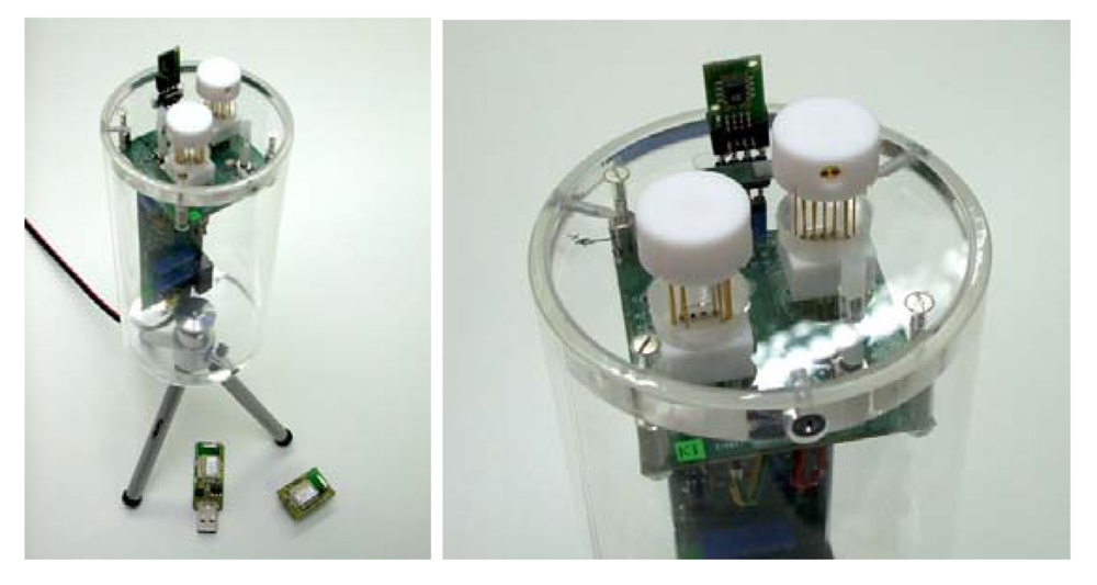 As shown in Figure 6, the sensing unit for outdoor experiment has a cylindrical can-size structure, with a sensing head on top that hosts two of the mutiparametric devices described above and one miniaturized thermo-hygrometer (Sensirion SHT71). Multiparametric devices were horizontally positioned on sensing head plan with a 90° angle between them, in order to provide the chance to use anemometers to characterize in-plan air velocity components. Moreover, the use of two devices with different metal-oxides as sensing layers may enrich the information concerning gas sensing.