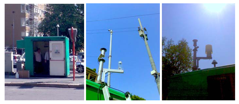 In collaboration with ARPA Lombardia (the regional agency in charge of air quality measurements), the wireless sensing unit was installed on the roof of one of the ARPA stations located downtown Milan, as shown in Figure 7. A position close to the access port of the tube collecting the air for GC instruments was chosen, in order to ensure the interaction with exactly the same atmosphere for both. A simple “mushroom-head”-like plastic cap was adopted to protect sensing unit from the rain. Power supply was wired, communication was wireless toward a PC equipped with a 6LoWPAN data router, which was located few meters down, into the station box. During the experiment gas sensors were continuously operated at 300 °C.