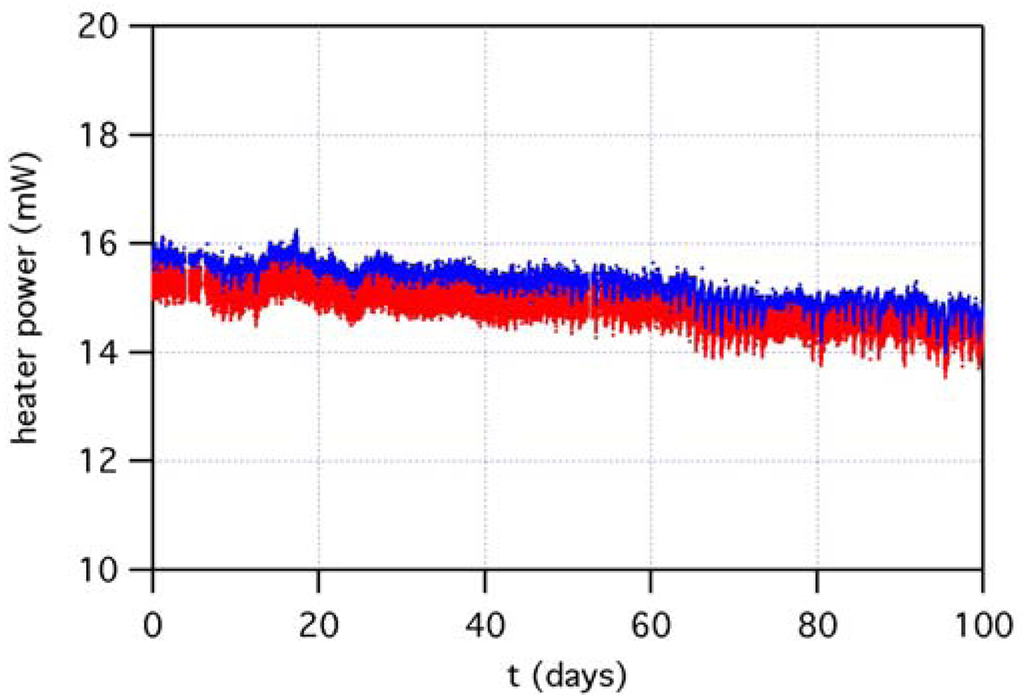 Robustness of sensor micromachined platform has been characterized through the monitoring of power on gas sensor heaters. In fact, the control of sensor operation temperature is performed by measuring the heater resistance, which depends on temperature, and by modulating the power accordingly. Any drift of the heather characteristics due to long-term, high-temperature operations would hence appear as a drift on power. Figure 8 shows heater power of both gas sensors, in the period between December 2010 and March 2011, as measured by the control system managing device temperature. Due to continuous operation at about 300 °C, the electrical characteristics along time of micromachined heater may be a meaningful indicator of the robustness of the platform, and of the underlying manufacturing technology. A continuous drift toward lower power is observed, indicating that a modification of the heater is taking place. In particular, the decreasing of the power may be explained with the increase of the resistance of the heater, at a given temperature: the control system associates higher resistance to higher temperature, hence decreases power. Although this behavior should result in some kind of drift also on gas sensing, no particular evidence of that appears from the gas sensing dataset (see below).