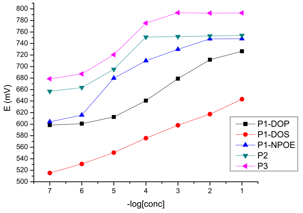 It is known that the plasticizers have a strong influence on the potentiometric response of the sensors, and also on the value of the slope. Hoping for an improvement of the slope value, we have made sensors 4 and 5 by changing the plasticizer NPOE with big dielectric constant (ε ≈ 24) for plasticizers having lower dielectric constants: DOS (ε ≈ 4) and DOP (ε ≈ 5.1).