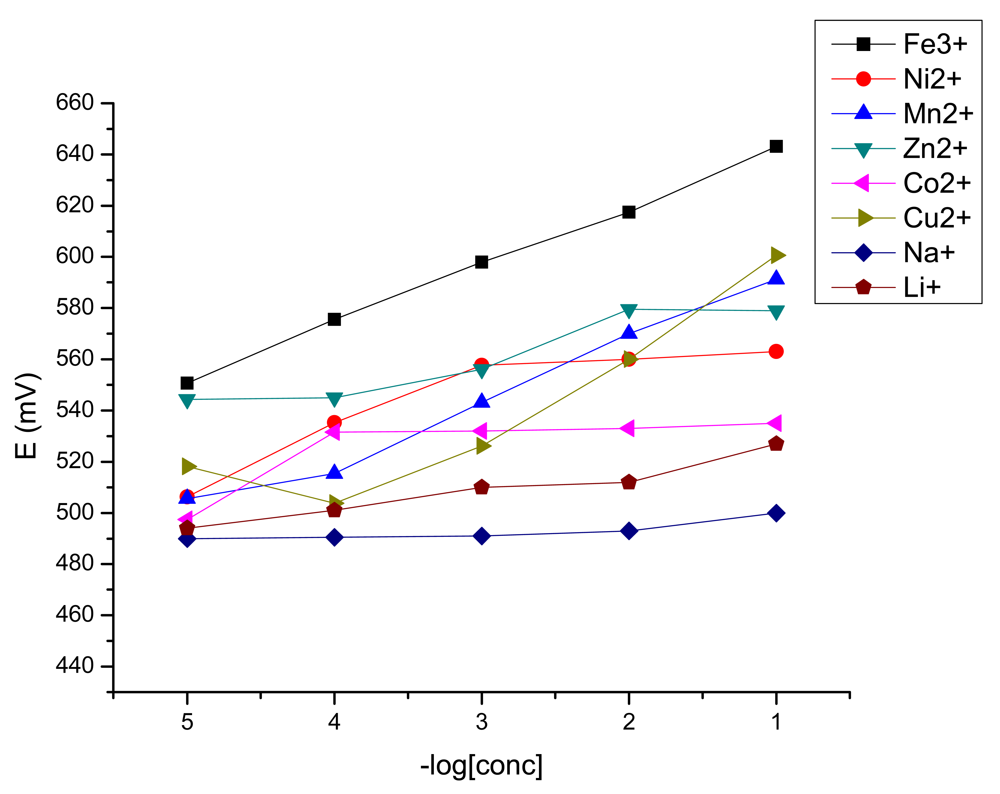 Synthetic leach liquors from spent lithium ion batteries, similar to the real ones [20], containing 1.36 × 10−2 M Mn2+, 8,48 × 10−2M Ni2+, 1 M Li+, 3.56 × 10−2 M Fe3+, 0,17 M Co2+ and 4,7 × 10−2 M Cu2+ were prepared by weighing the appropriate amount of each salt in double distillated water. The best obtained iron(III)-sensor was used for monitoring the iron in solutions by direct potentiometry. We have made three tests. First, solution A containing just the above mentioned quantities of the cations Mn2+, Ni2+, Li+ and Fe3+. Solution B was prepared from solution A by adding Co2+ and solution C from B plus Cu2+. The potential of the solutions was measured to see the iron recovery.