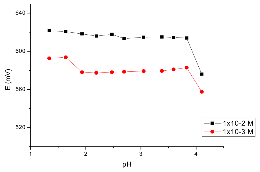The influence of the pH of the test solutions on the potential response of the electrodes was studied by using the 10−2 and 10−3 M iron(III) solutions adjusted with HCl and NaOH and the results are given in Figure 4.