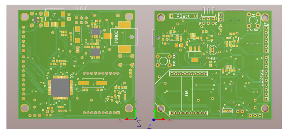 The system's master module is the processor, which is built around a 32-bit ARM7TDMI-S CPU with real-time emulation and embedded trace support. The actual microcontroller used is the LPC2148 which with its 512 K of high-speed flash memory and 32 K of SRAM data memory is capable of running a POSIX real-time kernel and many kinds of different routing algorithms. It also contains many interesting features including: a low-power Real-Time Clock (RTC) with independent power and a 32 kHz clock input; a 60 MHz maximum CPU clock available from programmable on-chip PLL; multiple serial interfaces including two UARTs; two fast I2C-bus (400 kbit/s); Serial Peripheral Interface (SPI) and Synchronous Serial Port (SSP) with buffering and variable data length capabilities; on-chip integrated oscillator operates with an external crystal from 1 MHz to 25 MHz and power saving modes that include Idle and Power-down. Therefore a USB 2.0 full-speed compliant device controller with 2 kB of endpoint RAM is embedded in the MCU. Figure 3 shows the WiSe mote PCB design which is 56 × 58 mm in size and of a two- layer type; the microcontroller package used is the 10 × 10 mm LQFP64. By using this kind of package it is possible to solder all components on the board manually, thereby saving time and cost for smaller volumes.
