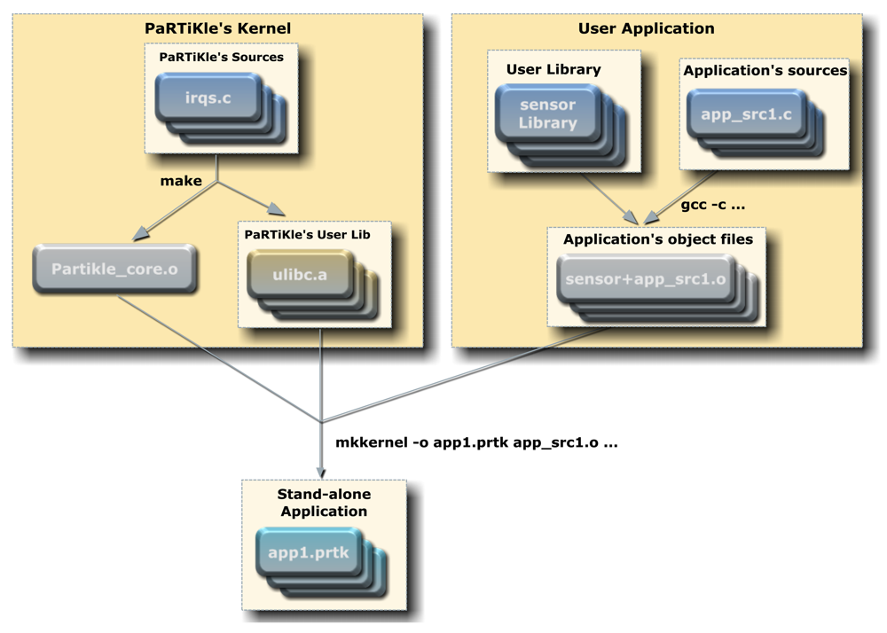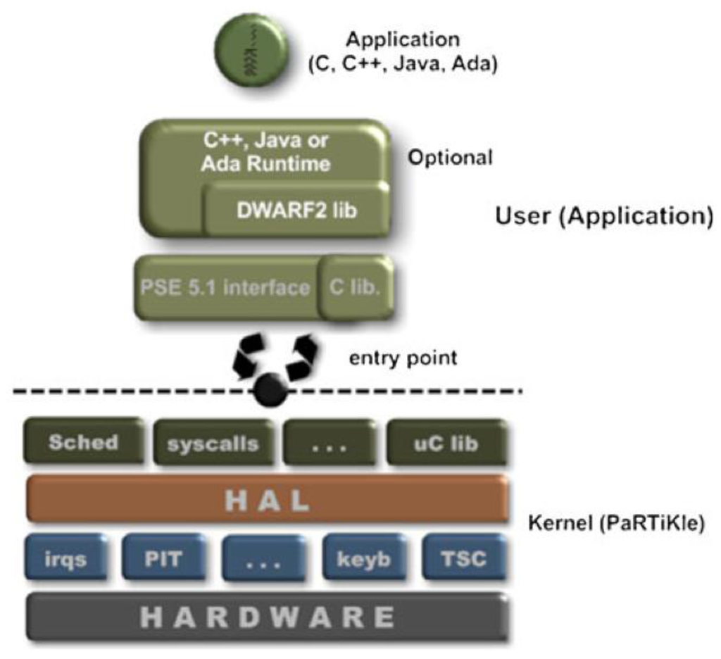 Contrary to other small embedded RTOS, which are implemented as a library that is linked to the application, PaRTiKle has been designed as a real-time kernel with a clean and well-defined separation between the kernel and application execution spaces. All kernel services are provided via a single entry point, which improves the robustness and simplifies the portability PaRTiKle to other architectures and environments.