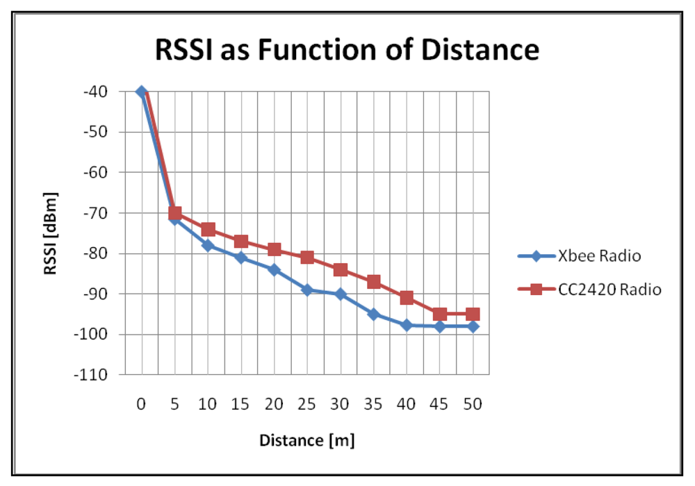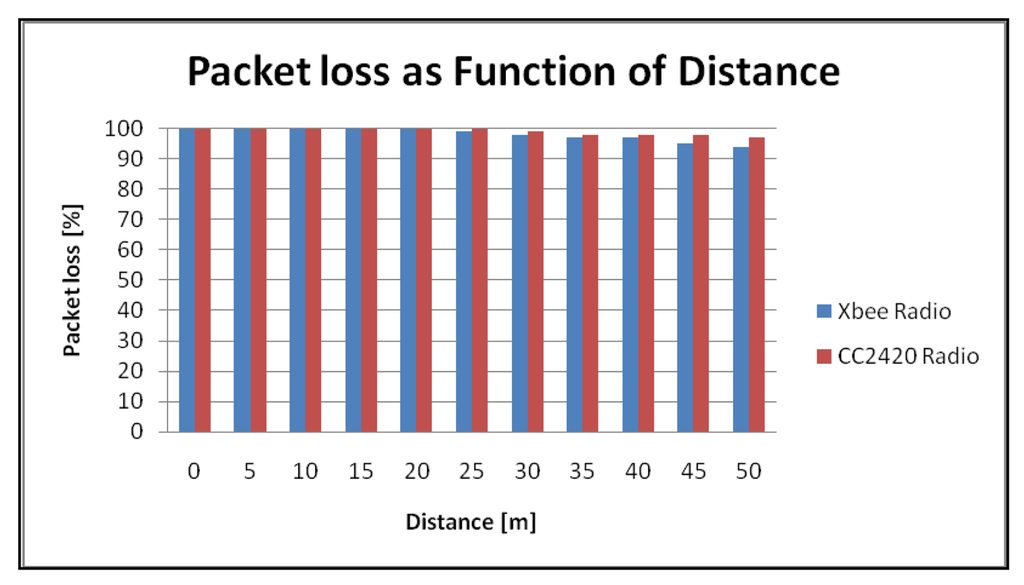 Figure 6 shows the received signal strength as a function of the distance for the Xbee and the CC2420 radios. The measures were taken in an open environment with line of sight (soccer field) and a maximum transmit power output configuration in both radios. The graph in Figure 7 illustrates the packet loss during the measurements. Results show that no communication problems were present at a distance of 50 m while transmitting at the highest power mode.