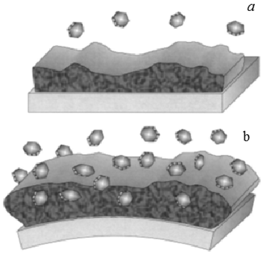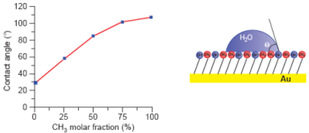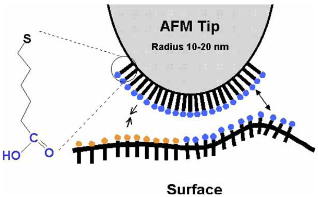 There are several ways to functionalize the AFM tip. Two of the commonest methods are known as mixing self-assembled monolayers (SAMs) and vacuum, thermal evaporation thermal vapor deposition and even, sputtering. The method of self-assembled monolayers (SAMs) is widely used to functionalize tips and surfaces. Terminal functional groups (-COOH, -CH3) are grafted onto alkane thiols that spontaneously form monolayers, under controlled conditions, on gold surfaces [9]. Organosiloxane monolayers (silanization) can also be formed on the tip [10]. The SAMs are usually applied by dropping reagents on the tip and then rinsing it after a specific time with another reagent (or ultra-pure water), or by the immersion of the tip into a specific solution (say in a beaker, like the Layer-by-Layer (LBL) process for thin films), followed again by washing. A typical result of SAM is depicted in Figure 1. Sometimes, the design of SAMs on a tip can follow the patterns of Nature; i.e., mimicry can be an excellent source of inspiration. Self-assembled monolayers offer new opportunities to increase the fundamental understanding of self-organization structure-property relationship, and interfacial phenomena [3]. SAMs can provide the needed design flexibility, as functionalized chains of polyethylene glycol (PEGs).