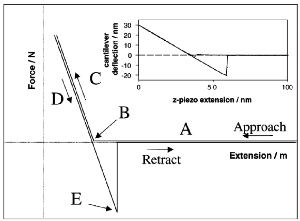 Force vs. distance curves (or force vs. displacement vertical curves) are used to collect quantitative and direct information on the force and adhesion forces between the AFM tip and the sample, including elongation, separation, elastic deformation (stretch), and binding forces. These curves can provide significant details of recognition events, homogeneity, chemical composition of the sample and biological events. Figure 3 briefly explains each part of a force vs. distance curve during the approach and retraction of the tip. Note that the force at point E is the pull-off force, defined as the highest force required separating the probe from the surface [27].