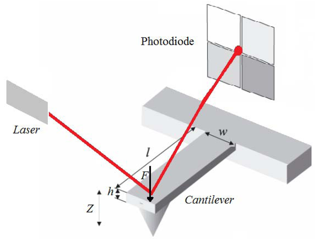 Microcantilevers were first used in Scanning Force Microscopy. The deflection of a cantilever can be measured with an optical sensor when it is a small deflection; the vertical displacement of the tip (Z) is directly proportional to the force on it (F) and is thus a direct measurement of the strength of interaction between the tip and a surface (Figure 5). The principle of operation of a cantilever sensor is based on the adsorption of analytes at the surface of the cantilever (coated with a sensing layer), which usually leads to an induced surface stress and an increase of the apparent mass of the cantilever [8–34]. The change in mass leads to deflection of the cantilever in the Z direction.