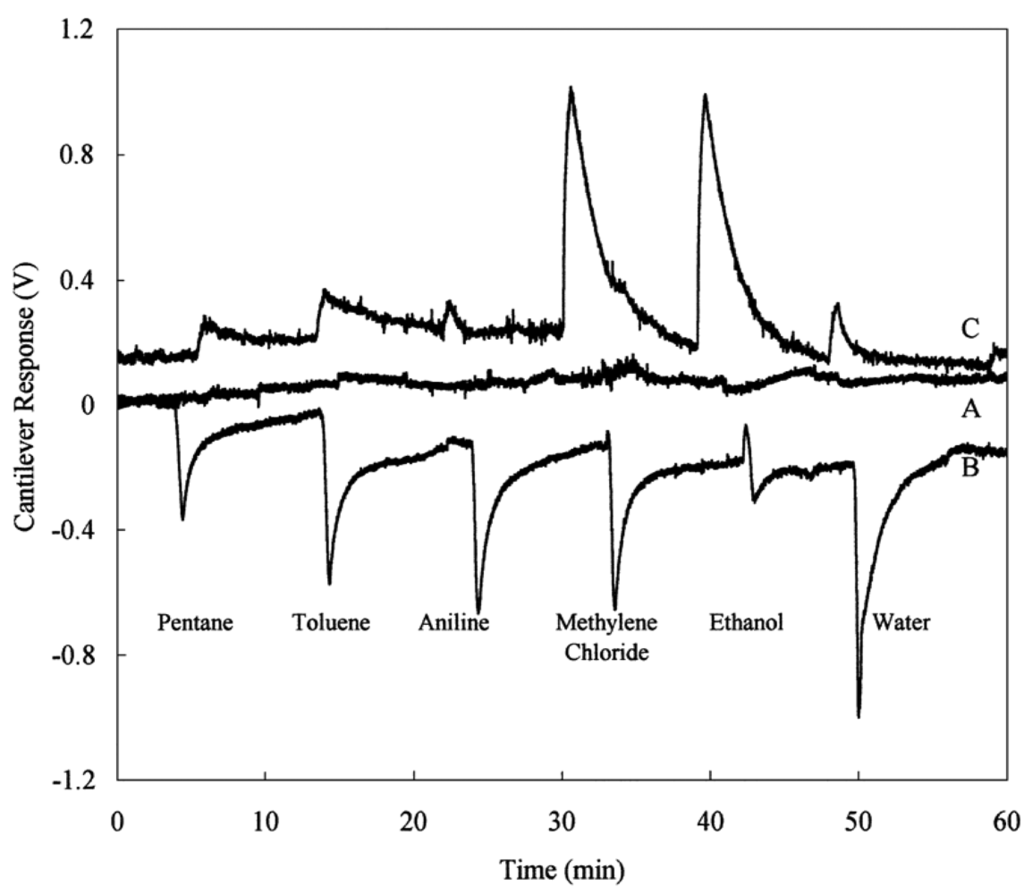 Sub-ppm sensitivity and the response of piezoresistive cantilevers arrays coated with different polymers [polyvinyl alcohol (PVA), polyethylene imine, polyacryl amide and polyvinyl pyrrolidone] to detect various alkanes were investigates [53]. It was demonstrated that this array of sensors coated with different polymers had the selectivity of discriminated individual alkanes in a homologous series using principal component analysis of the pattern formed from the responses of polymer-coated cantilevers. Accordingly, the sensitivity of the piezoresistive cantilever was determined to be 0.05–0.13 ppm. The adsorption of analytes on the polymer layers induces surface stress due to swelling of the polymers, resulting in the bending of the cantilevers. The adsorption of water molecules on the surface of the cantilever increases its mass and thereby decreases its resonance frequency.