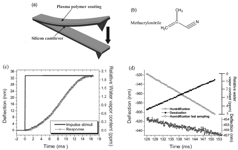 Silicon microcantilevers for humidity detection were studied by Singamaneni et al. [52]. The cantilever with a low flexural rigidity was coated with a plasma-polymerized methacrylonitrile monolayer [Figure 8(a,b)] and it showed for instantaneous changes of humidity a response time of 9.5 ms in the range from 10 to 90% of humidity [Figure 8(c)]. It was observed a linear response in the ramps of humidification and desiccation (1% of relative humidity per second) showed in [Figure 8(d)], with resolution of ±10 ppb of water vapor. The authors suggested that the desirable responsive behavior of the bimaterial cantilever is associated with the integration of a crosslinked polymer, high internal stresses, and firm adhesion to the silicon.