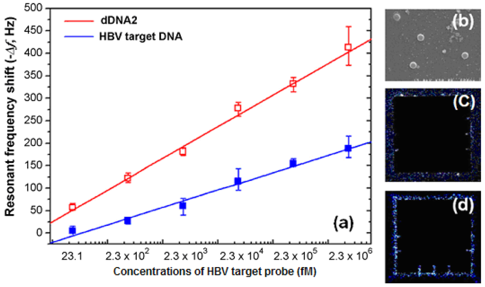 The combination of the microcantilever with a highly specific enzyme provides a unique approach to quantifying enzyme substrates without the complication of sample labeling. The detection of hepatitis B virus DNA was achieved with a silica nanoparticle-enhanced microcantilever sensor. Gold-coated microcantilevers were functionalized with thiolated cDNA. Cr/Au layers (10 nm/50 nm) were deposited on the bottom side of the microcantilever with an e-beam evaporator. The resonant frequency was measured by an impedance analyzer and the working concentration range was approximately from 23 fM to 2.3 × 106 fM (Figure 9) [72].