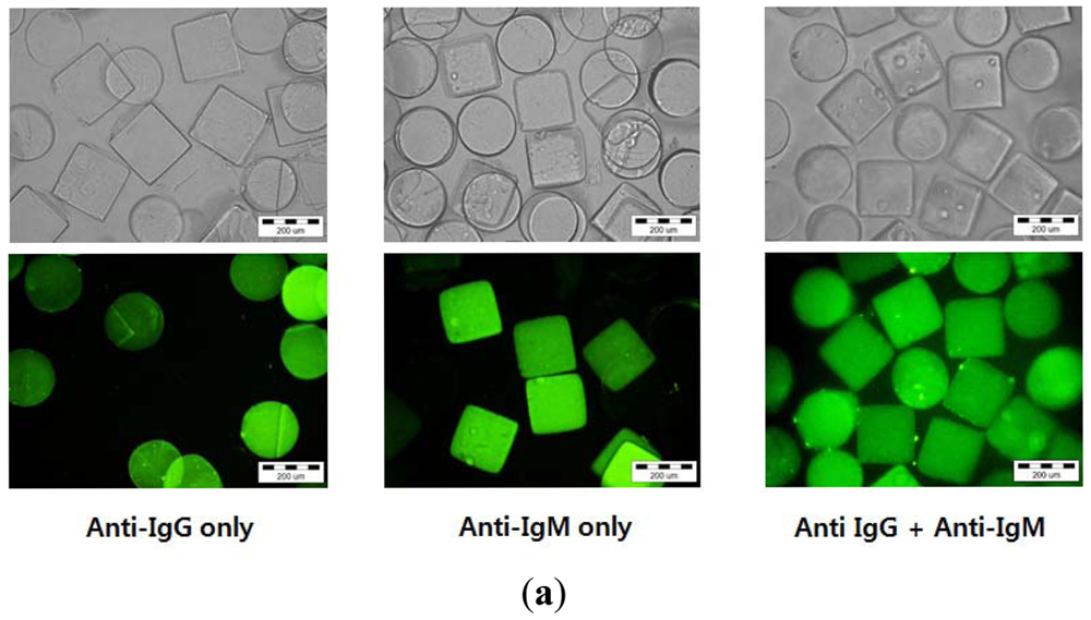 Finally, we demonstrated simultaneous analysis of different immunoassays using suspension arrays of hydrogel microparticles. As a proof of concept, multiplex analysis was performed with two different shapes of hydrogel microparticles, circular hydrogel immobilizing IgG and square hydrogel immobilizing IgM. The two suspension arrays were prepared separately and combined in a well plate at a 1:1 volume ratio. Each reaction was identified by the hydrogel microparticle shape, generating a shape-coded suspension microarray system. Five different samples (mixtures of FITC-anti-IgG and FITC-anti-IgM) were prepared and reacted with the suspension arrays of shape-coded hydrogel microparticles. When a solution containing either anti-IgG or anti-IgG was introduced, only the hydrogel microparticles immobilizing corresponding probe molecules emitted green florescence without any cross-talk, as shown in Figure 5(a). Conversely, introducing a solution containing both anti-IgG and anti-IgM resulted in fluorescence from both hydrogel microparticle shapes (Figure 5(a)). Figure 5(b) shows the change in fluorescence intensity from circular and square microparticles when a mixture of anti-IgG and anti-IgM with different concentration ratios was reacted with microparticles. Both anti-IgG and anti-IgM were successfully detected. The intensity values from both shapes of hydrogel microparticles were in good agreement with previous results from anti-IgG-only and anti-IgM-only solutions. This indicated that the presence of one analyte does not have an effect on the other analyte.
