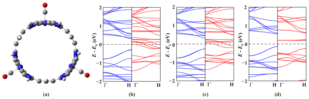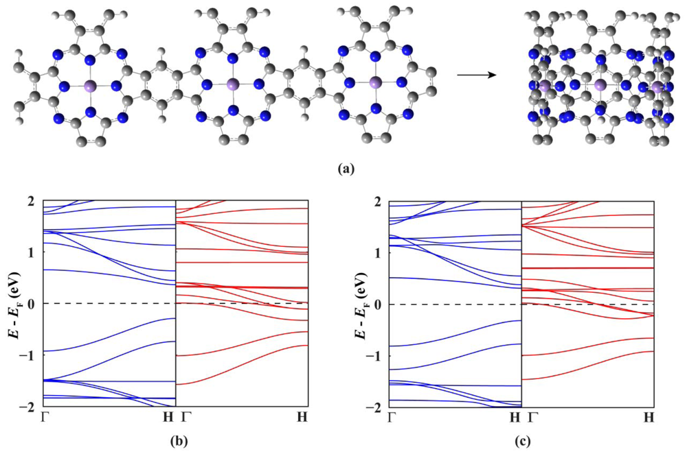Now we move to investigate the electronic and magnetic properties of single-walled MnPc nanotubes. For the sake of brevity, these nanotubes are denoted by MnPc-n where n is the number of MnPc monomers in one unit cell. Figure 2(a) shows the optimized geometric structure of the thinnest MnPc-3 nanotube. Because the radius of the MnPc-3 nanotube is only 5.05 Å, the Mn-Mn distance perpendicular to the tube axis is calculated to be 8.642 Å which is about 2.07 Å shorter than that along the tube axis, demonstrating the large curvature of the tube wall. In order to know the effects of curvature of the tube wall, we compare the spin-resolved band structure (Figure 2(c)) of the MnPc-3 nanotube with that of the MnPc nanoribbon with the same number of MnPc monomers along its width (Figure 2(b)).
