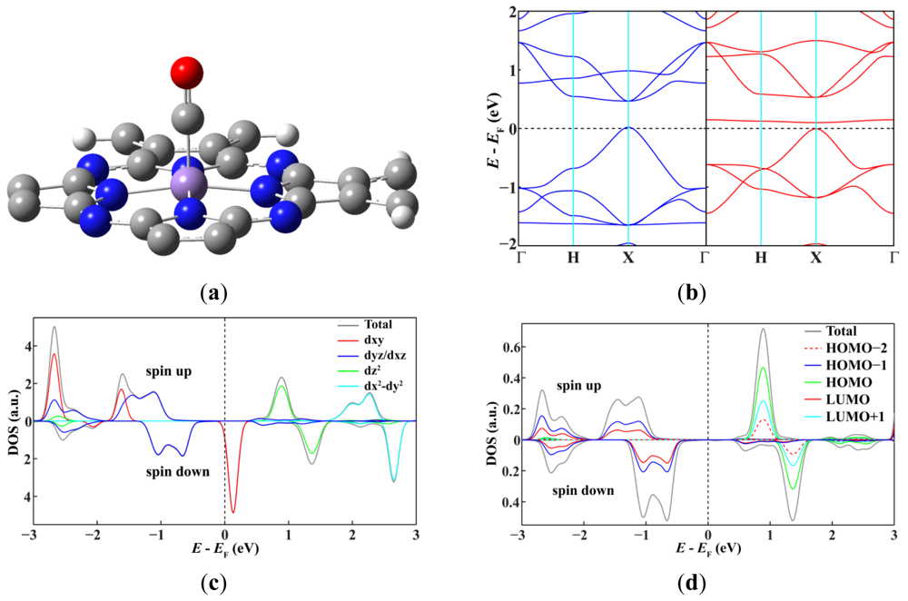 Because the curvature does not change the spin state of the Mn ions, we can analyze the mechanism of tuning the spin state of the Mn ions by using a simpler model, i.e., the adsorption of CO on the 2D MnPc sheet. As shown in Figure 4, CO binds to the Mn ion of the 2D MnPc sheet in a linear configuration, giving a binding energy of 1.08 eV. The strong interaction between the Mn ion and the CO molecule leads to a redistribution of electrons in the energy bands dominated by the Mn 3d atomic orbitals resulting a change of the spin state. DOS projected onto the Mn 3d atomic orbitals shows that adsorption of CO empties the spin-up energy band dominated by the Mn 3dz2 orbital and shifts it to 0.77 eV above the Fermi level, leaving the spin-up energy bands dominated by the Mn 3dxy, 3dxz and 3dyz orbitals still below the Fermi level. In contrast, adsorption of CO fills completely the spin-down energy bands dominated by the Mn 3dxz and 3dyz orbitals and thus moves them from around the Femi level to more than 0.62 eV below the Fermi level. Thus, the magnetic moment per unit cell of the 2D MnPc sheet adsorbed with one CO molecule is only 1.0 μB. Considering that the highest occupied molecular orbital (3σ) and the lowest unoccupied molecular orbital (1π*) of CO respectively make contributions to the DOS peaks located above and below the Fermi level, we can conclude that the interaction between the CO molecule and the Mn ion in the MnPc-related structures is a typical metal-ligand bond which can be described in terms of donation of electron density from occupied molecular orbitals of CO and back-donation from the Mn 3d orbitals with appropriate symmetry and energy into unoccupied molecular orbitals of CO [29].