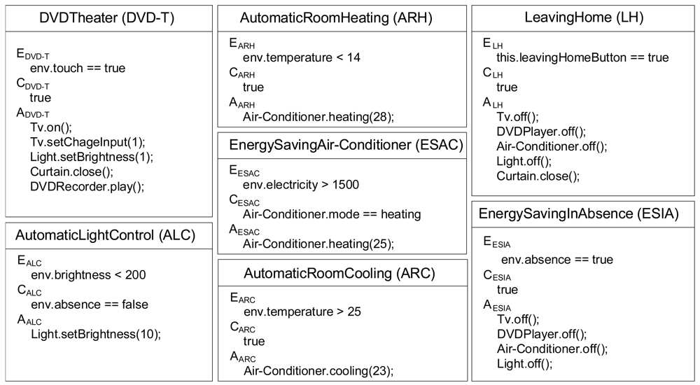 Research and development of home network systems (HNS) draws great attention as a key technology for the smart homes [,]. In the HNS, household appliances (e.g., TV, DVD Recorder, air-conditioner, lamp, fan) and equipments (e.g., curtain, ventilator, ceiling light) are integrated via a network to achieve various value-added services. Moreover, introducing sensors (e.g., temperature, brightness, motion, electricity, touch) to the HNS can provide autonomous sensor-driven services. A sensor-driven service is triggered automatically, depending on a designated context characterized by sensor values. Examples of the sensor-driven services are listed as follows []: