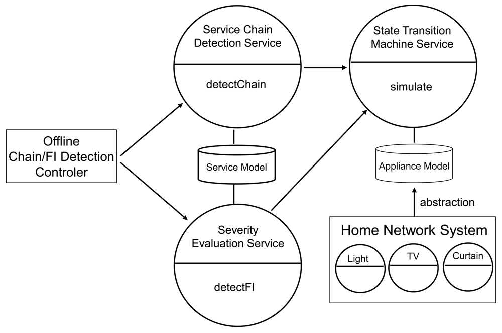 Figure 2 shows the architecture of our service chain/feature interaction detection system. Our system consists of a state transition machine service, a service chain detection service, a severity evaluation service and an offline service chain/feature interaction detection controller. The chain detection controller detects service chains and feature interactions by invoking the service chain detection service and the severity evaluation service. Henceforth, the details of each component are explained.