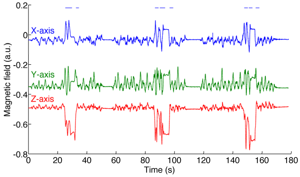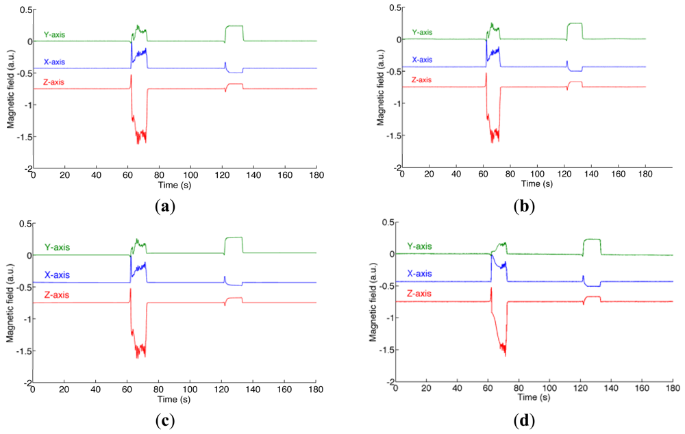 The experimental validation tests were carried out using the Xsens MTx orientation sensor, whose raw data were delivered to a host computer via a USB interface at a rate of 100 Hz. The manufacturer expressed the measurements of the magnetic field in arbitrary units (a.u.).