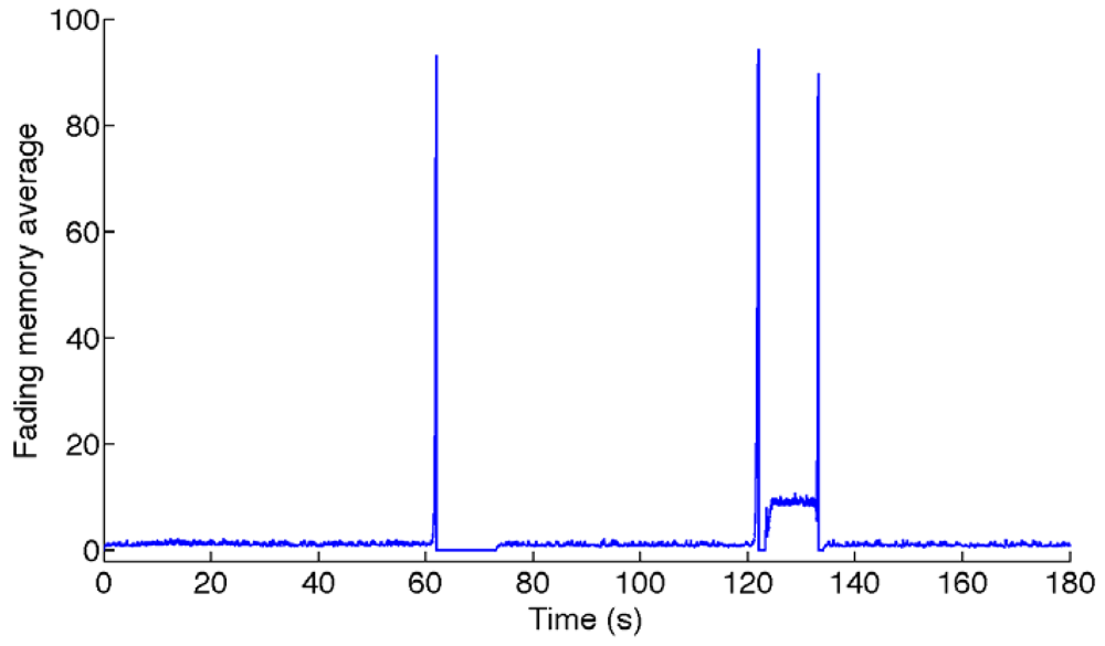 To implement the VSD-EKF we apply the technique discussed in [26]. The switching from the quiescent to the higher-order EKF is based on computing a fading memory average of the normalized innovation squared from the quiescent EKF (a = 0.9). The switching takes place when the fading memory average of the normalized innovations exceeds a given up-crossing threshold. The fading memory has an effective window length s, and the onset of the magnetic perturbation is taken at the beginning of this window. As for the initialization of the higher-order EKF, when a magnetic perturbation is detected at time k, the algorithm assumes that the magnetic distortion has a constant rate of change starting at k − s − 1. Then, the higher-order EKF equations reprocess the IMU measurements sequentially up to time k, before sequentially processing incoming measurements at later times. The scheme for reverting to the quiescent EKF is based on using a fading memory average of the normalized innovation squared computed for the extra-state components of the GM-2 model; the fading memory average is then compared to a given down-crossing threshold. When falling below the threshold the quiescent EKF is called on again.