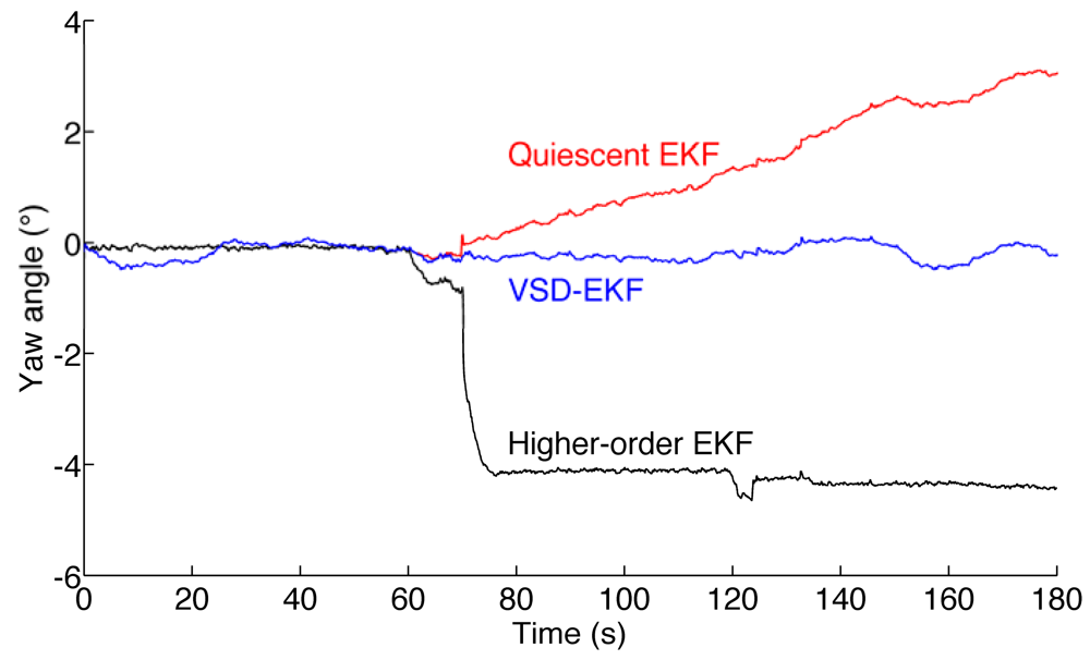 Quite typically, the yaw estimates produced by the adapted quiescent EKF may drift even when quiet magnetic conditions are restored after a disturbance occurrence. This is due to its limited capability of accurately tracking the time-changes of the magnetic field when they occur. The inability of the adapted higher-order EKF to produce accurate yaw angle estimates in magnetically perturbed conditions is quite surprising, in the face of the success met by the SVD-EKF, whose model in magnetically perturbed conditions is essentially the same. A possible explanation is that the higher-order EKF is extremely sensitive to the strength of the GM-2 driving noise. In conditions of magnetic quiet, the higher-order EKF tends to diverge when the driving noise strength is too large. With those values of the driving noise strength that are acceptable in conditions of magnetic quiet, the algorithm tends to perform very poorly when the magnetic field is about to change. This does not occur with the SVD-EKF, which relies on the quiescent EKF in conditions of magnetic quiet. As expected, the switching to the higher-order EKF increases the algorithm capability of accurately tracking the time-changes of the magnetic field. In conclusion, we catch the best by combining the two models together as done in the VSD-EKF, which shows good accuracy of the estimated yaw and good compensation of the magnetic disturbances.