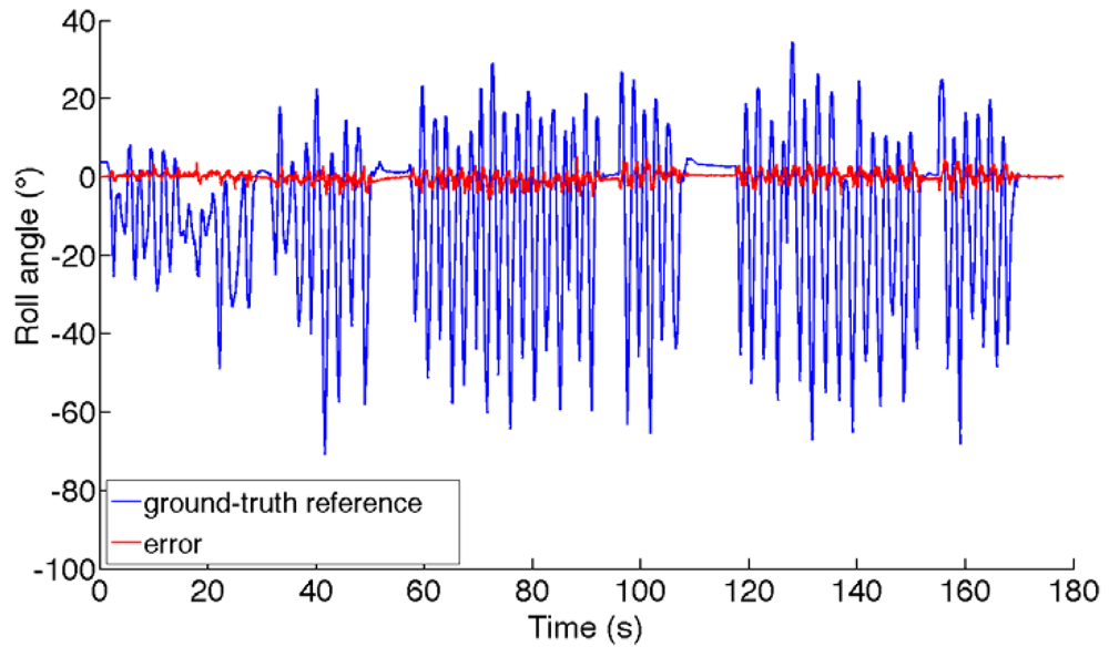 The results of the dynamic test show the effectiveness of the proposed VSD-EKF and basically confirm the results of the static test. Not surprisingly perhaps, the RMS errors affecting the roll and pitch angle estimates are worse than in the static test. A possible reason may be due to slight imperfections in the synchronization process between IMU and Vicon data streams and errors incurred by the optical motion analysis system itself in generating the ground-truth reference orientation data used for computation. Another reason is certainly that the acceleration measurements cannot be explained by gravity alone. Although slow in nature, the IMU motion determines additional components in the acceleration measurements that cannot be taken into account when they are used in the measurement update of the EKF. The trick we choose to mitigate this problem is to increase the values of the accelerometer measurement noise standard deviation in the matrix R, as compared with the value used during the static test, Table 2. Vector selection schemes are not considered in this paper as a means to guard against the effects of body motions. In our ongoing research on using the VSD-EKF to process the measurements from the inertial/magnetic sensors embedded in a state-of-the-art smartphone, we are planning to investigate how vector selection methods can be exploited in the case of faster body motions than those considered in the present work.