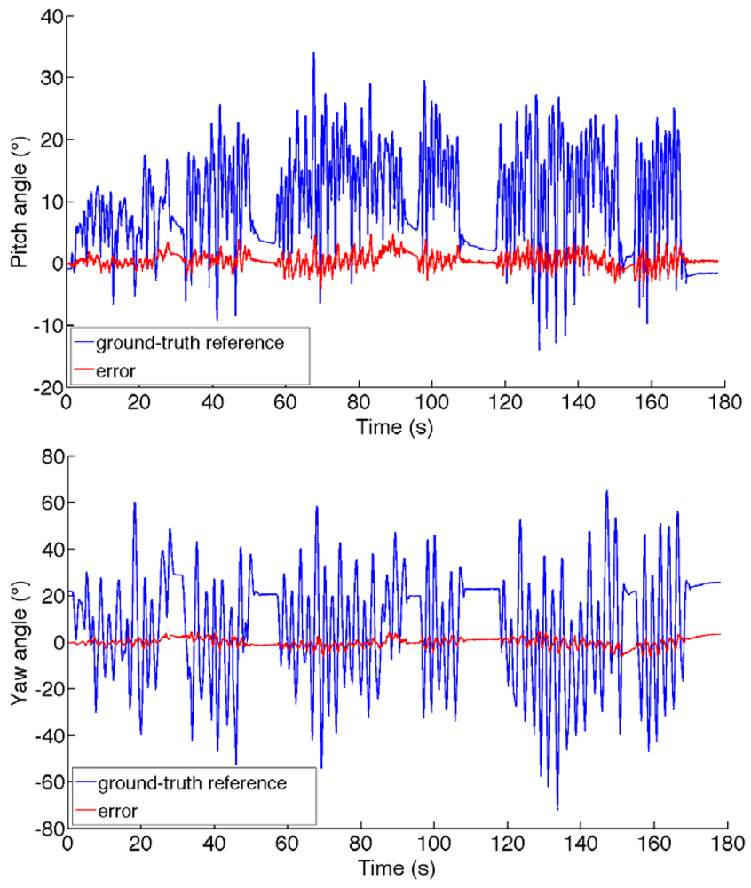 The ground-truth orientation was obtained by processing the marker coordinates provided by the optical motion analysis system as described in [8]. The Euler angles time functions delivered by the EKFs were obtained from the estimated quaternion using standard conversion formulas. We then computed the RMS errors incurred by the EKF in estimating the Euler angles using the ground-truth orientation as reference.