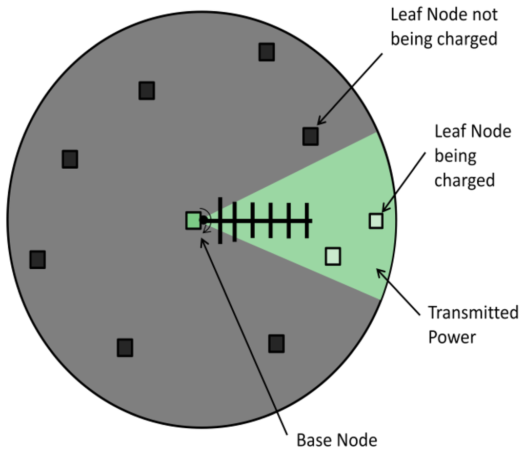 To improve the next seeking efficiency, the base node logs the azimuth angle of leaf nodes it has found to its memory. The next time a charging request is issued by a previously charged leaf node, the base node antenna can be rotated directly to the correct azimuth angle, reducing the time and energy required for the seek cycle. If the leaf node is stationary, charging will then begin straight away. If it is a mobile node and moved since the last charge, it will enter the seek protocol allowing its new location to be found starting from its last known location.