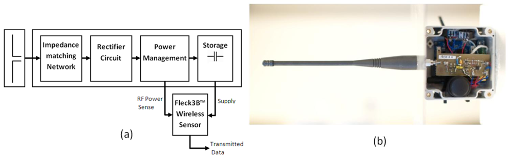 The design for the harvester circuitry is based around a similar architecture to that used in [4–7]. This involves the use of an impedance-tuned rectifier circuit to convert the received RF power into a useable DC voltage. Figure 2(a) shows the modules which make up the leaf node's circuit, this consists of a secondary 50 Ω omni-directional receiving antenna (433 MHz), a high pass impedance matching network, rectifier circuitry, power management, energy storage and a Fleck™3B wireless sensor. The rectifier circuitry selected for this application was a two-stage Dickson voltage multiplier. Karthaus et al. [5] discusses the benefits of this topology. It also exhibits a clean and simple circuit layout and a manageable impedance change. The harvesting circuit's impedance changes because of different received powers, due to different separation distances and storage device voltages as the battery or supercapacitor charges.