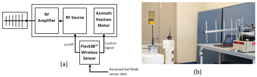 The base node uses the transmitter structure outlined in Figure 3(a). The function of this design is to autonomously direct RF power to the location of the leaf nodes. A low power commercially available transmitter oscillator with no modulation was used to generate the 433 MHz signal. This signal was increased using an RF amplifier, and the voltage supplies were adjusted to give 20 dBm (100 mW) output power from the RF amplifier. This RF power was transmitted outward using a commercially available directional Yagi antenna.
