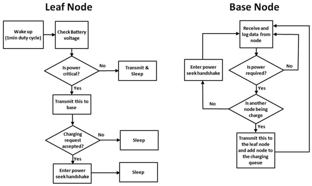 All the leaf nodes wake up on 1-minute intervals. Their wake-up schedules are staggered to prevent multiple leaf nodes from waking up at the same time. Upon waking up, the node checks its battery voltage; if this is critically low, the node will raise a flag in its normal transmission to indicate to the base node that charging is required; it then waits for a response from the base node. The base node will respond with a transmission to indicate whether the charging request has been accepted or denied. Charging is denied if another node is already receiving a charge.
