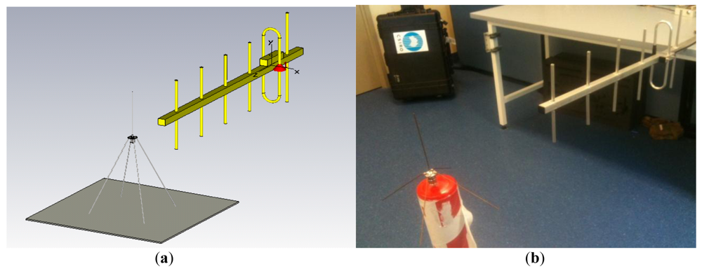 The antennas are operating in the near field, so equations for far field path loss cannot be used to determine the RF power level that can be received by the leaf-node antennas, and would also ignore the effect that mutual coupling will have on the power transfer. Instead, the antenna arrangement was modeled using CST Microwave Studio and a two-ray propagation model [15,16]. Figure 5(a) shows this 3D model.