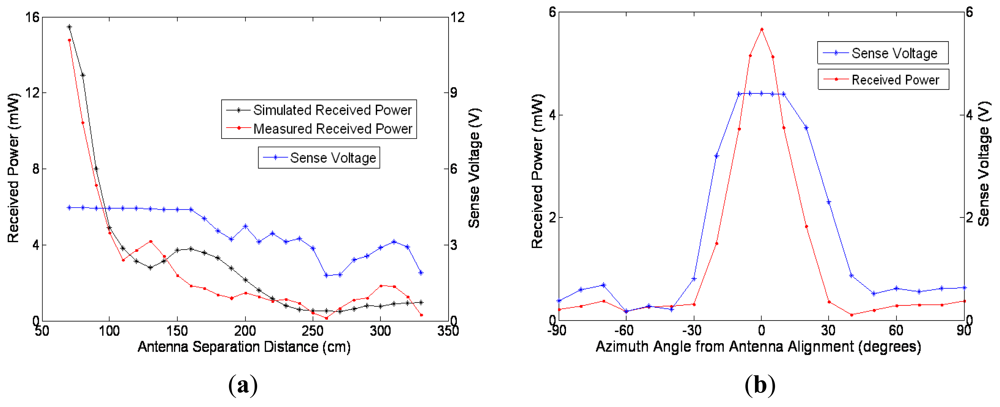 Figure 6(b) shows the measured received RF power and sense voltage at a separation distance of 1m while the antenna scans from −90° to 90° with the leaf node located at zero degrees. This plot verifies the use of the sense voltage to determine the alignment of the leaf node and the base transmitter. Comparatively to Figure 6(a), it can be noticed the peak of the sense voltage levels off as it meets the condition described in Equation (1).