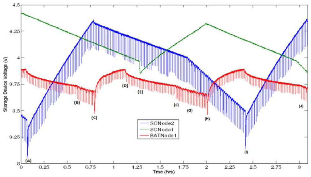 Near the beginning of this time segment marked by (A), BATNode1 (a leaf node powered from a NiMH battery) has reached its upper trigger voltage and ceased charging. Since SCNode2 (a leaf node powered by a Panasonic supercapacitor) is below its lower trigger voltage, it has previously requested charging from the base and is sitting in the charging queue within the program on the base node. It then enters the seek protocol which can be noted by the lower spikes at (A); once found this node begins charging. Midway through the charge, noted by (B), BATNode1 has reached its lower trigger voltage, since SCNode1 is not 100% full, charge is denied. As mentioned in Section 3.2, the power required for the receive operation to tell BATNode1 to go back to sleep is the reason for the increased slope of discharge. When SCNode2 reaches its upper threshold voltage at (C), the base then seeks out BATNode1 until it is found and begins charging. Since this location is stored in the memory from the last seek search, the node is found straight away. If the node had moved since the last charge, it would have been found again and the new location stored in the memory. When BATNode1 reaches its upper trigger voltage at (D) no nodes require charging, at this point the base node shuts down the transmitter. This idles until SCNode1 requests power at (E) where the node is tracked and begins charging. This cycle continues, with these same functions reoccurring at (F–J), maintaining the energy storage levels of all nodes in the network.