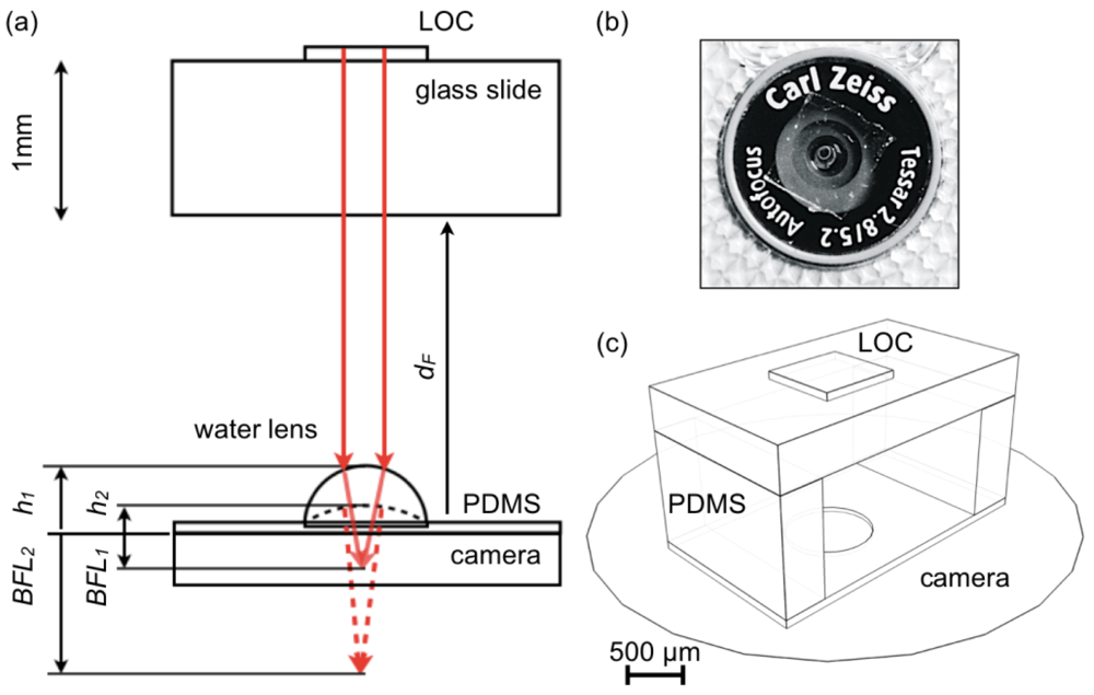 Intact cell phone cameras cannot focus at the short distances required by this concept, and the LOC must incorporate a refocusing element to image its micrometric detection area. Simple fixed lenses can be implemented for a particular camera type [13]; however, different brands and models have slightly different optical designs, and a generic solution to this problem demands to adapt to all of these conditions with a unified concept. Adaptive optics is central for autofocusing and can be implemented in different ways [14–17] as dedicated components, but in this work we seek a solution that can be embedded in disposable LOC devices, such as a sessile drop [18–20] complemented by data analysis.