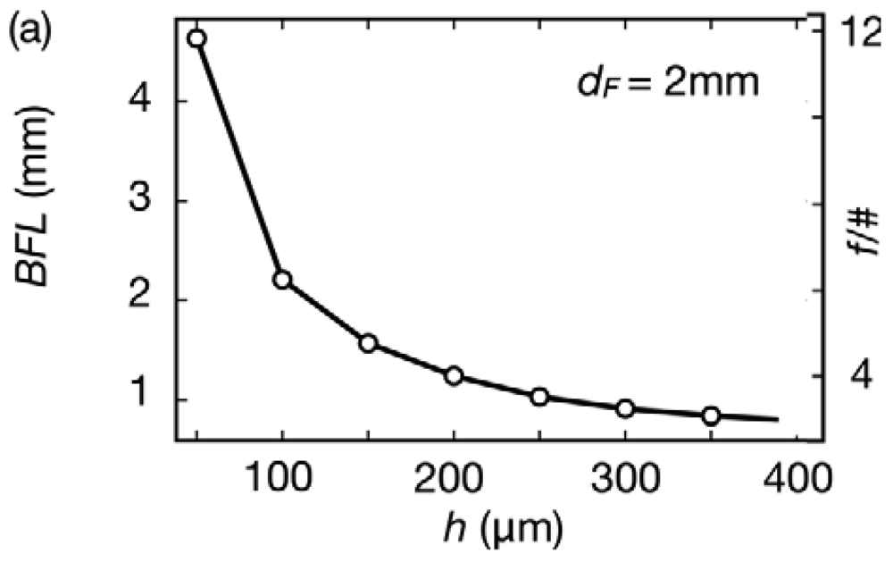 Figure 2 collects the optical simulation of the lens shown in Figure 1(a). Figure 2(a) shows the behavior of the BFL for h values between 50 and 400 μm at a fixed dF of 2 mm. A small variation of 350 μm in h controls a BFL change of more than 4 mm. In the same way, the aperture of the system decreases with the curvature, implying a greater depth of field at longer BFLs (and smaller h values).