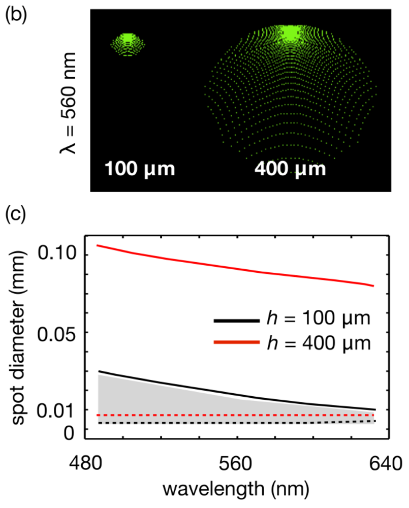 As can be seen, the expected performance increases at longer wavelengths almost approaching the diffraction limit for 630 nm and h = 100 μm. Overall, the spot diameter is between 10 and 100 μm depending on the curvature and illuminating conditions, and under 30 μm for systems that operate with BFLs longer than 2 mm.